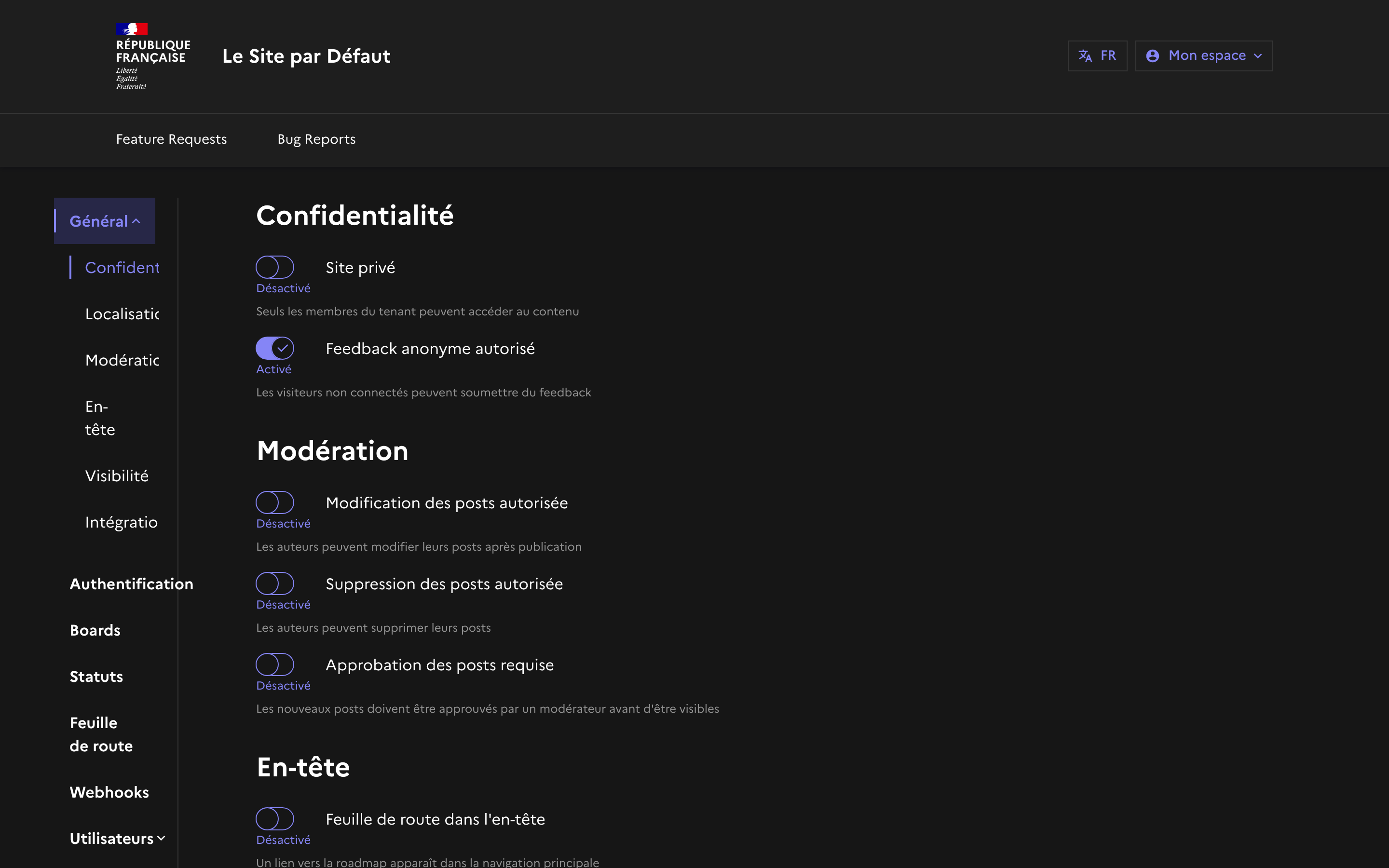 | Purger les données | Supprime toutes les contributions, votes, commentaires, statuts, tableaux, épingles et suivis de l'espace. Seuls les membres et les paramètres sont conservés. Utile pour repartir de zéro sans recréer l'espace. |